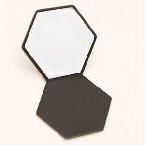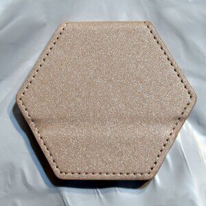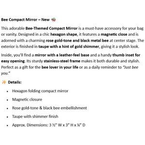 This adorable Bee-Themed Compact Mirror is a must-have accessory for your bag or vanity. Designed in a chic hexagon shape, it features a magnetic close and is adorned with a charming rose gold-tone and black metal bee at center stage. The exterior is finished in taupe with a hint of gold shimmer, giving it a stylish look.