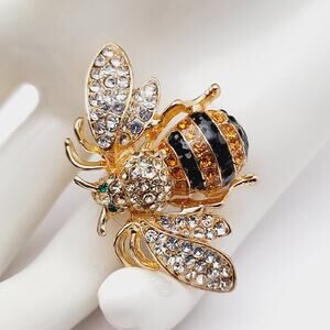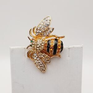 This is a gorgeous Ricinni gold plated bee brooch, perfect for adding a touch of whimsy to any outfit! The brooch features clear, black, and yellow rhinestones that catch the light beautifully. It's in excellent condition and ready to wear or add to your collection.