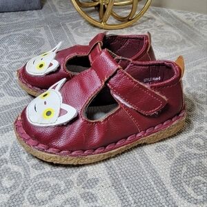 Adorable maroon red soft leather Mary Jane style shoes with kittens on the toe box. T strap with hook and loop closures. Gum soles.