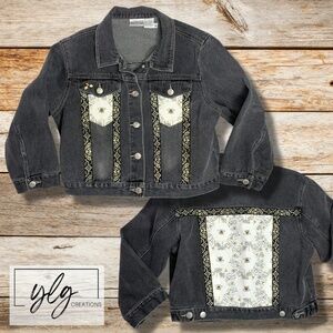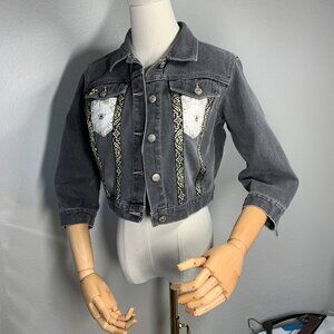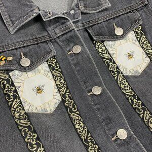 Bee Jean Jacket Gray Trucker Hand Crafted Jacquard Trim Cropped Jeanology 10