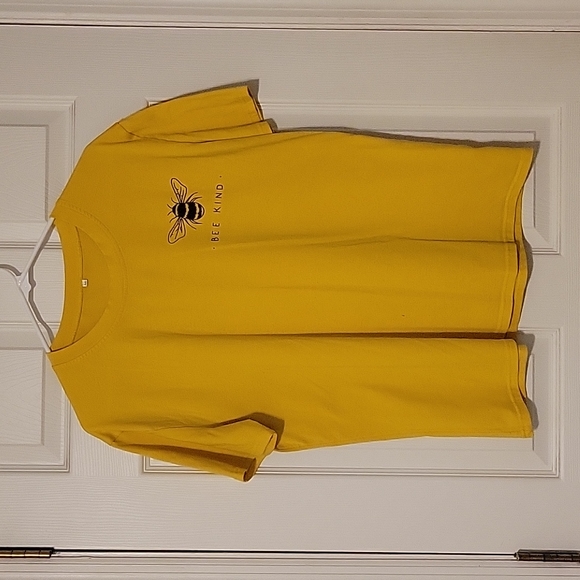 Size XL, no brand, Bee Kind logo with bee print on the front left chest, small black mark on front as pictured, guc otherwise.
