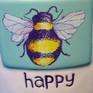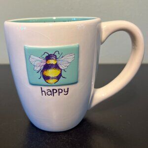 Bee Marvelous white ceramic mug with a raised rectangular aqua medallion featuring a yellow and black bumblebee 🐝above the word, happy. Aqua interior features black text below the rim that reads, laugh a little! Large and comfortable easy-to-grip handle. Microwave and dishwasher safe. Measures 4.5” tall with a 3.5” diameter; 5.75” across including handle. Holds 15 fluid oz. From Bee Marvelous, 2009 Ms. Michal Sparks for DEMDACO.