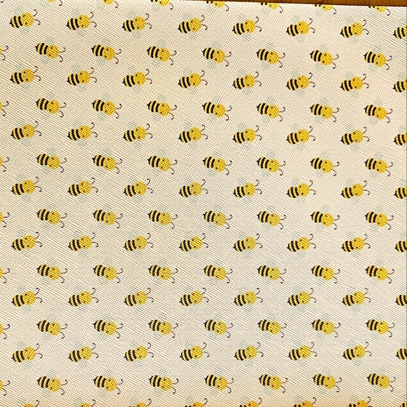 Charming fabric with a bee pattern. Features yellow and black bees on a cream background. Faux Leather. 9x11 sheet