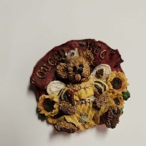 Charming bee-themed bear brooch adorned with sunflowers. Features a cute bear in a bee costume with wings.
