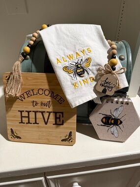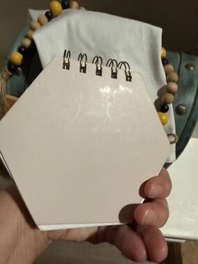 Hexagon-shaped spiral notepad with a detailed bee illustration. Always ๐ Kind tea towel, ๐ decorative wooden bead decor and a wooden trivet that says Welcome to our HIVE ๐๐๐. One of the corner cushion stickers is gone. I usually just take them off. ๐๐๐๐๐๐