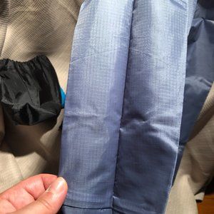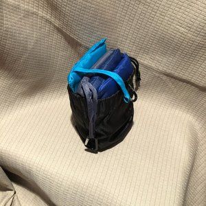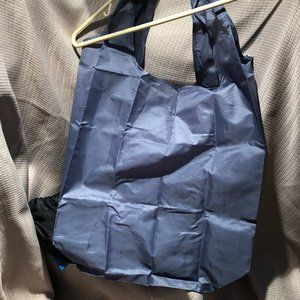 BeeGreen Reusable set of FOUR bags for shopping in an assorted pouch, each bag is in solid color--one gray, one teal, one navy, and light blue. Each bag is 14' x 16" x 5" with shoulder strap; shoulder drop 11". All new--