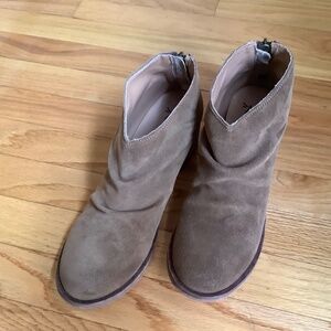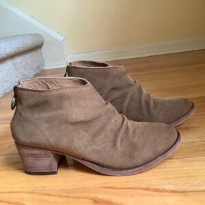 A classic mid-heeled short-shaft suede boot with back zipper.