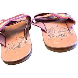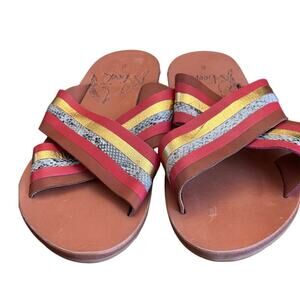 Step into artisan style with these Beek “Palila” Slide Sandals. Crafted by hand with luxurious leather, these size 6 flat sandals feature a vibrant crisscross strap design in metallic gold, pink, brown, and faux snakeskin print for a bold, eye-catching finish. A bestseller at Anthropologie.