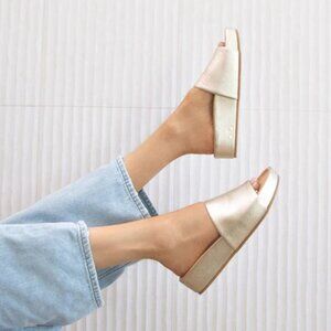 Step into luxury with these stunning Beek “Pelican” Platform Leather Slide Sandals in a platinum gold tone — brand new with tags (no box). Sold at Anthropologie, this sleek, sustainable design fuses comfort and style for the perfect warm-weather statement.