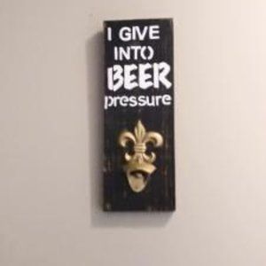 I just love this fun wooden wall plaque, with a beer bottle opener at the bottom! It makes a great gift or a fun piece for that "Man Cave". It is in a black stained wood with a gold rub. The beer bottle opener is in a gold iron. The size is 5.5"w X 14.75"h X .75"d.