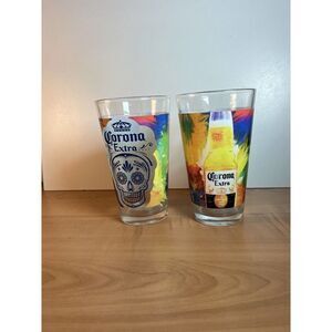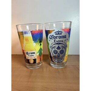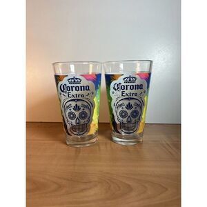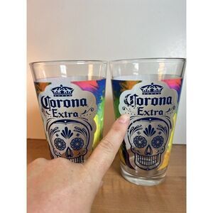 Enjoy your favorite beer in these two stylish CORONA Extra Cerveza glasses featuring a unique Mexican Day of the Dead Sugar Skull design. The glasses are perfect for any beer enthusiast and are a must-have addition to any collection. The glasses are made for everyday use and are perfect for any occasion. The brand, Corona, is known for its great taste and quality, making these glasses a perfect fit for any beer lover.