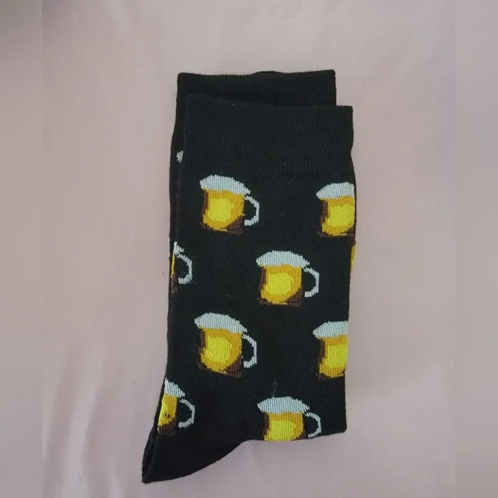 Step up your sock game with these stylish black socks featuring a fun beer mug pattern. Perfect for casual wear or adding a playful touch to your outfit.