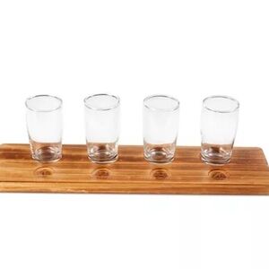 Beer Sampler Tasting Flight Set, 4 glasses and wood board. Excellent pre-Owned condition. Board is 18”, 4 1/2” wide. Has carved hand grips underneath shown in picture. Glasses are 4 1/4” tall