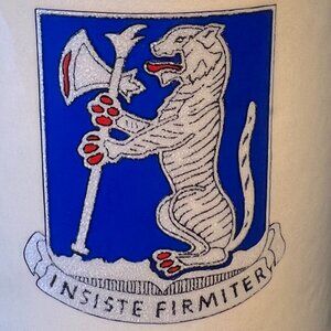 Stoneware beer stein / mug bearing the crest insignia of the United States Army 77th Armor Regiment Unit, nicknamed the Steel Tiger, or the Steel Tiger Battalion. The blue crest features a silver carnivorous tiger with red accents holding a battle axe that symbolizes the offensive mission of a tank battalion and its readiness and formidable combat strength. The unit's motto, INSISTE FIRMITER, is displayed on the bottom ribbon scroll and translates from Latin as, Stand Firmly or Stand To It Stoutly. Measures 5.25” tall with a 3” diameter; 5.25” across including handle. Holds .5 Liter.