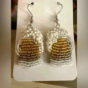 Beer mug beaded earrings New, never worn Fast shipping Smoke free home Beer, eclectic, beads, yellow, gold, white, dangle, different