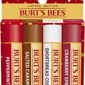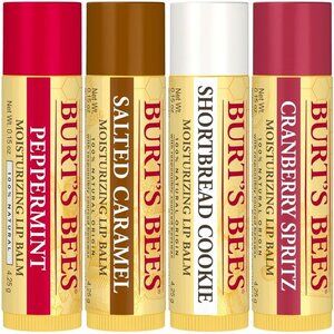 Give the gift of kissable lips this holiday season. Burt's Bees Moisturizing Lip Balms nourish and make your lips feel luxurious. Infused with powerful fruit extracts and Beeswax to richly moisturize and soften lips, the nourishing oils and butters will make your lips juicy, happy and healthy looking. Indulge in your favorite Holiday flavors with Shortbread Cookie, Cranberry Spritz, Salted Caramel and Peppermint. With a matte finish and moisturizing balm texture, these tint free tubes of lip balm glide on smoothly to nourish dry lips while keeping them revitalized and hydrated. Conveniently tuck a tube into a pocket or purse, so that you can keep natural, nurturing lip care handy. These 100% natural origin beauty products are formulated without parabens, phthalates, petrolatum and SLS and will beautify and revitalize your lips. Use these natural origin Burt's Bees Moisturizing Lip Balms to make lips feel their best. This four-pack is a great stocking stuffer or gift for a friend, coworker or loved one!