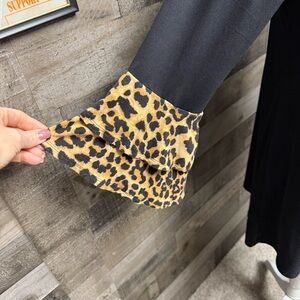Stylish women's black swing dress featuring chic leopard print sleeves. Perfect for a trendy and bold look. No fabric or size tag but it is stretchy and flowy.