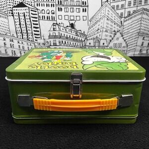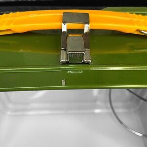 There is some cosmetic chip and scratch damage to the metal from wear and age to the edges, sides, and corners to the metal on the lunchbox (see photos). The metal around the handle has some slight discoloration (see photos). There is a dent on the upper right side of the lunchbox and two dents on the upper left side of the top of the lunch box near the handle (see photos).