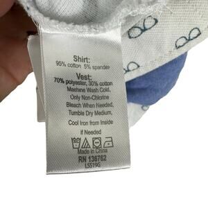 Excellent preowned condition. White short sleeve collared onesie with eye glasses print, has faux vest with faux buttons. Has detachable bowtie & 1/4 button up front. Snaps in crotch. All one piece. Onesie is cotton/spandex, vest is polyester/cotton material. Size 6-9 Months.