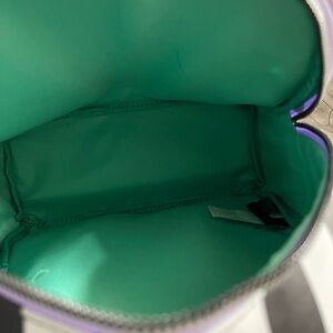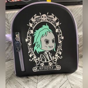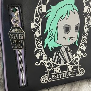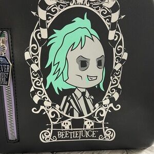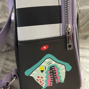 With the cutest backpack, you can be the spirit! This mini Beetlejuice backpack features a cartoon version of Beetlejuice, framed by skulls and sandworms. Attention, there are sandworms on the sides. This backpack is lined with lavender details on the zips, carry handles and straps. Features a vertical front pocket with a "Never Trust the Living" coffin zipper and silver tone details.
