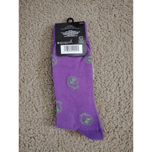Design: These purple socks feature a fun, all-over pattern of bright green Beetlejuice heads. The top of the socks showcases a larger graphic of the iconic Sandworm from the film, with the classic "BEETLEJUICE" logo prominently displayed on the tag.