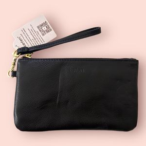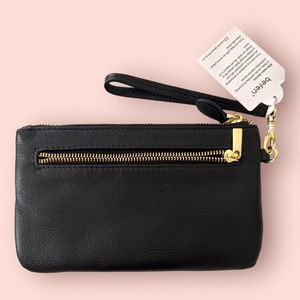 This black pebbled faux leather wristlet by BEFEN is a stylish addition to any outfit. With a zip closure, it has a size of 8.5" in width and 5" in height, with a 7” wristlet strap making it perfect for carrying just the essentials. The wristlet features a black handle/strap and gold hardware accents. The interior is lined with brown fabric and has enough space to store your phone, keys, and other small items.