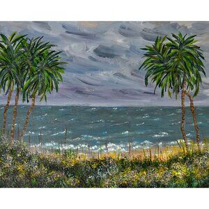 This original 8"x10" seascape acrylic painting titled "Before The Storm" captures the dramatic beauty of a coastal scene just before a storm. With expertly rendered storm clouds and choppy waves, the artwork brings a sense of movement and tension. The vibrant palm trees and sea grass add a touch of nature's resilience to this evocative piece.