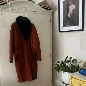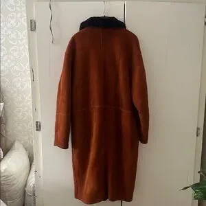 Begedor vintage burnt orange suede Shearling and style with this elegant with black teddy bear lining jacket featuring a luxurious black collar. Perfect for any occasion. Size M ( is missing one button in the middle)