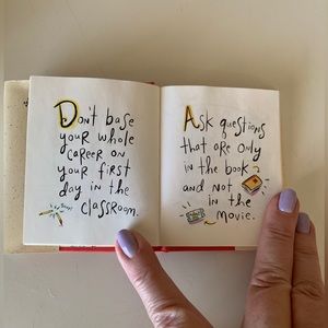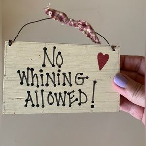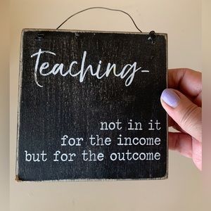 A bundle of 3 teacher items that includes 2 wooden signs and a small book. One of the signs is handmade and says No Whining Allowed! It has a wire hanger to hang on the wall. It measures 5” x 3”. The second wooden sign is black with white lettering. The words say Teaching-not in it for the income but for the outcome. It has a wire to hang it as well. Made by Hobby Lobby. It measures 5” x 5”. The tiny book Teach the Important Stuff Before the Fire Drill is filled with cute teacher sayings. Perfect for a new teacher.