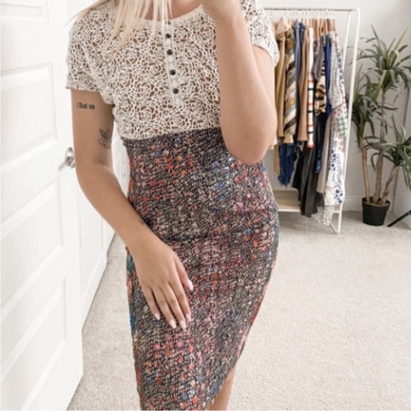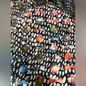 Skirt portion is multicolored: black, pink, blue, red, green and white in a modified mesh like design on front and back with stretchy gored panels along each side. Print is reminiscent of a Monet Giverny French watercolor painting!