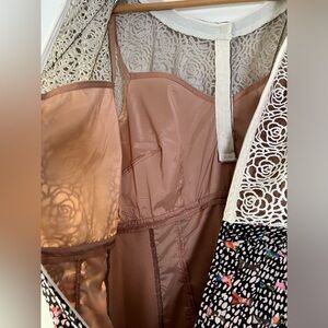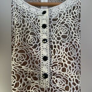 Top portion is ivory colored lace in an intricate rose floral pattern with nude under layer. Buttons along the top front.