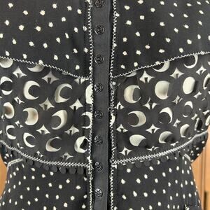 • Black with off white geometric asymmetric dots and circle/moon shape laser cutouts