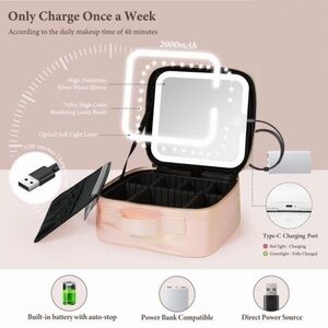 Behaesty Portable Makeup Bag with 3-Color LED Detachable Mirror 2000mAh USB Rechargeable Waterproof PU Leather Organizer Compact Travel Cosmetic Pouch.