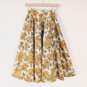 Beige A-Line Basque Waist Midi Skirt with Mustard Yellow Roses - Has Pockets XS