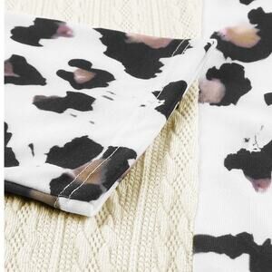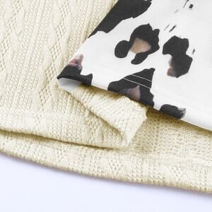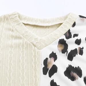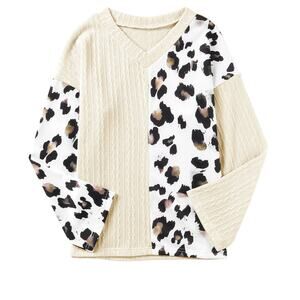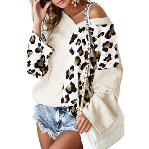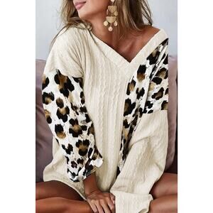 Beige Asymmetric Leopard Patchwork Wide Sleeve V Neck Sweater New S, M