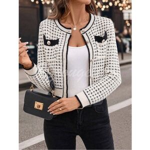 Beige (Cream) Black Button Up Cardigan Knit Long Sleeve