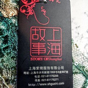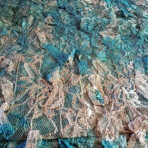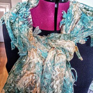 Lightweight and fun beige and blue silk lace oblong scarf/wrap from Story of Shanghai designer studio.