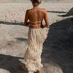Beige Boho Women's Sexy Backless pleated Transparent Halter Neck top & skirt set