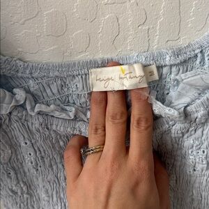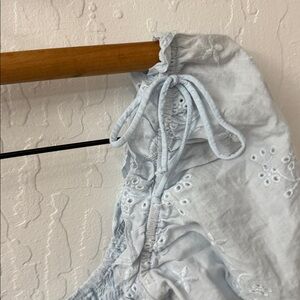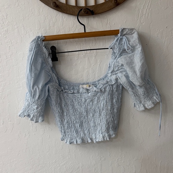 Beige Botany Blue Eyelet Smocked Crop Tie Shoulder Puff Sleeve Floral Blouse M