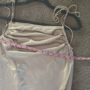 No major flaws. This elegant cream sleeveless dress is perfect for any occasion. Its sleek design and soft fabric offer both comfort and style.