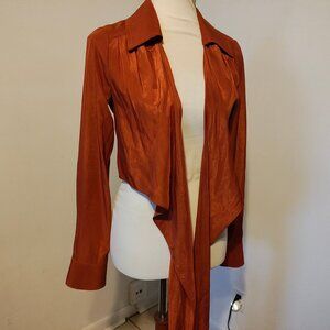 Beige Botany. Rust/Deep Orange. Collar. Long sleeves. Wrap around top. Bow in front or back. Size small.