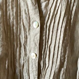 Stylish beige button-up blouse with pleated front. Perfect for casual or formal wear. PN025