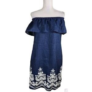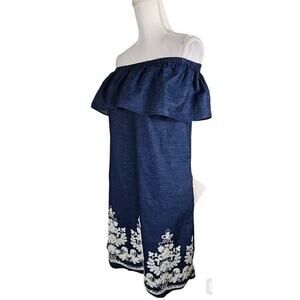 Beige By Eci ~Woman Size S~ Blue/White Embroidered Off-Shoulder Dress Unlined.