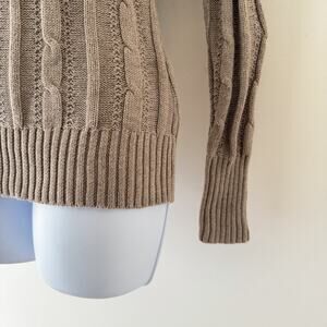 Classic and timeless with a nostalgic Y2K edge. This soft taupe cable knit sweater features a flattering V-neckline, slim fit, and wide ribbed hem and cuffs. Made from 100% cotton for breathable comfort, it’s perfect layered over a collared shirt or styled on its own for an effortlessly preppy look.