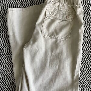Stylish beige casual pants with an elastic waistband and back pocket detail.