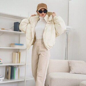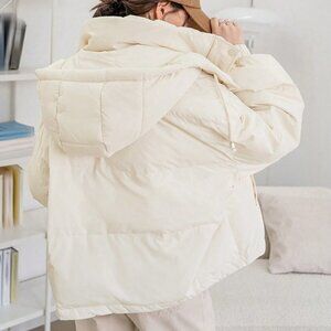 Beige Casual Womens Drawstring Hooded Puffer Coat