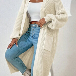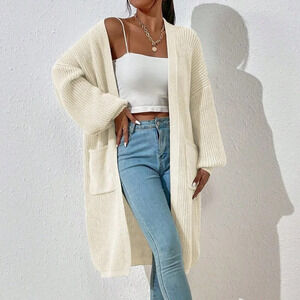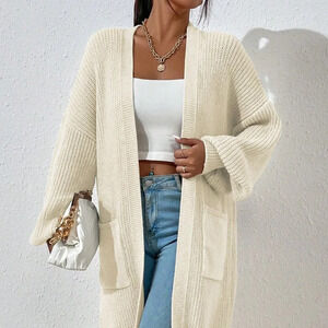 Beige Casual Women's Dual Pocket Drop Shoulder Open Front Cardigan
