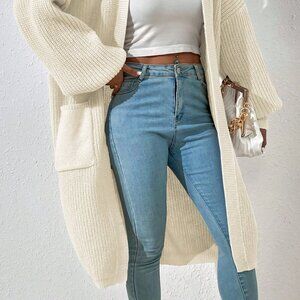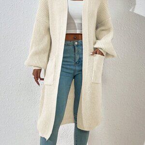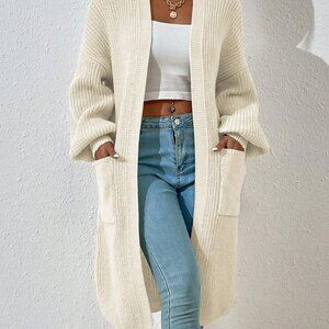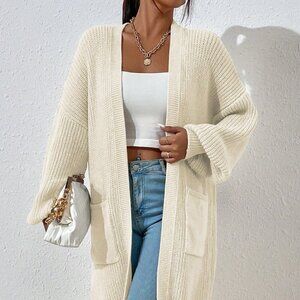 Beige Casual Women's Dual Pocket Drop Shoulder Open Front Cardigan