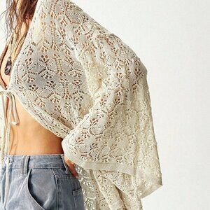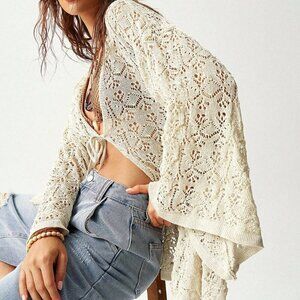 Beige Casual Women's Hollow Out Knitted Cardigan With Flared Sleeves