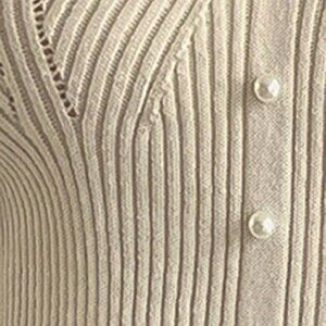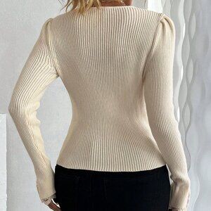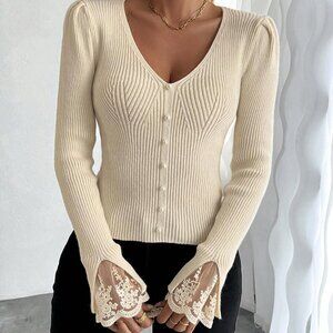Beige Casual Women's Lace Patchwork V-Neck Fitted Knit Sweater
